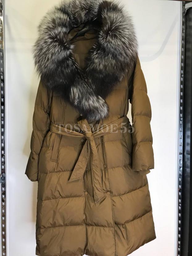 Длинный пуховик цвета хаки с чернобуркой